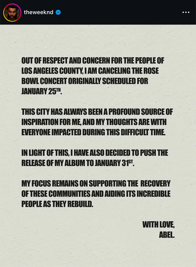 The Weeknd has cancelled his concert due to the devastating fires in California. If you entered “The Weeknd: An Epic Experience,” we’re so sorry to share this news, but we can all agree that everyone’s safety is what matters most right now. Our hearts go out to the hundreds of thousands who have been impacted by the wildfires.