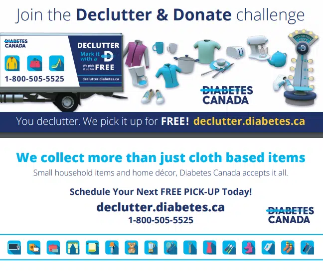 Hey Canada! This Spring, Join Diabetes Canada Declutter and Donate Challenge. We’ll pick up your small household items and gently used clothing FOR FREE. Help us to collect 5 million pounds and Keep your items out of landfill and help fund Diabetes research.