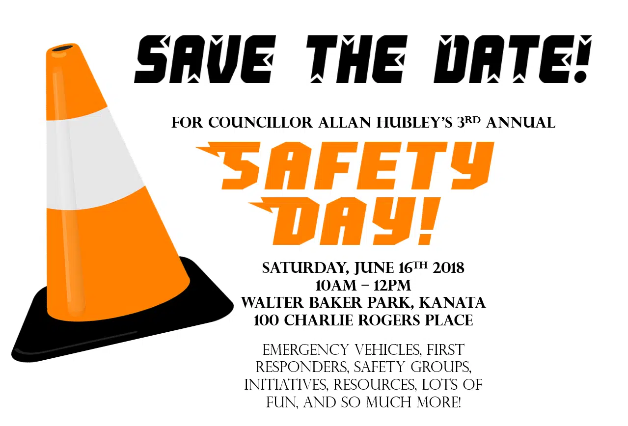 Councillor Hubley's 3rd Annual Safety Day is a free event at Walter Baker Park in Kanata on June 16th, 2018. The event will run from 10AM-12PM. Emergency vehicles, first responders, safety related groups, initiatives and organizations will all be in attendance. Should you have any questions about this event, please feel free to e-mail destini.mclean@ottawa.ca